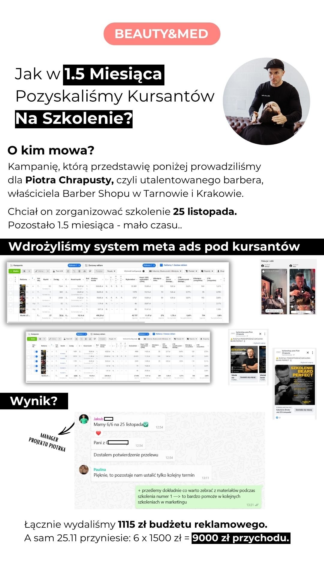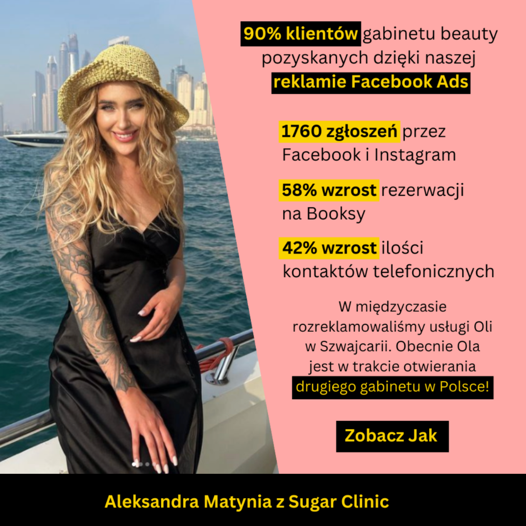 U Aleksandry - pomogliśmy zacząć stawiać jej pierwsze kroki w branży medycyny estetycznej. Dosłownie od poziomu: brak fanpage, instagrama --> po kompleksowy system marketingu online, który zapewnił jej już klientki w pierwszym miesiącu funkcjonowania firmy. A na wypełnienie grafiku na miesiąc w przód - czekaliśmy tylko 5 miesięcy i to przy małych budżetach.